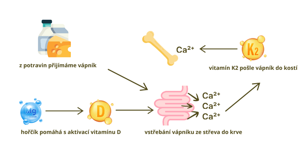 Vitamín K2 pomáhá směrovat vápník do kostí a chrání cévy a měkké tkáně. Hořčík je nezbytný pro aktivaci vitamínu D na jeho účinnou formu a zároveň podporuje správnou funkci nervů, svalů a srdce.